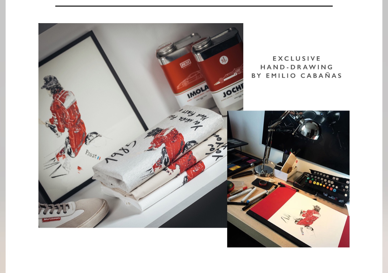 “2019 garment collection, collaboration between 8Js and Emilio Cabañas, a swiss-spanish artist that share our passion, our love and our dedication for racing” Sacha Prost