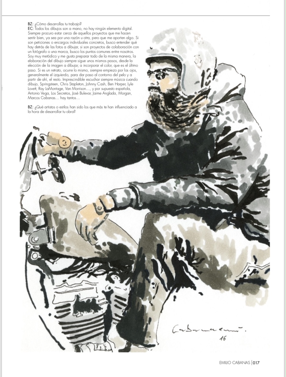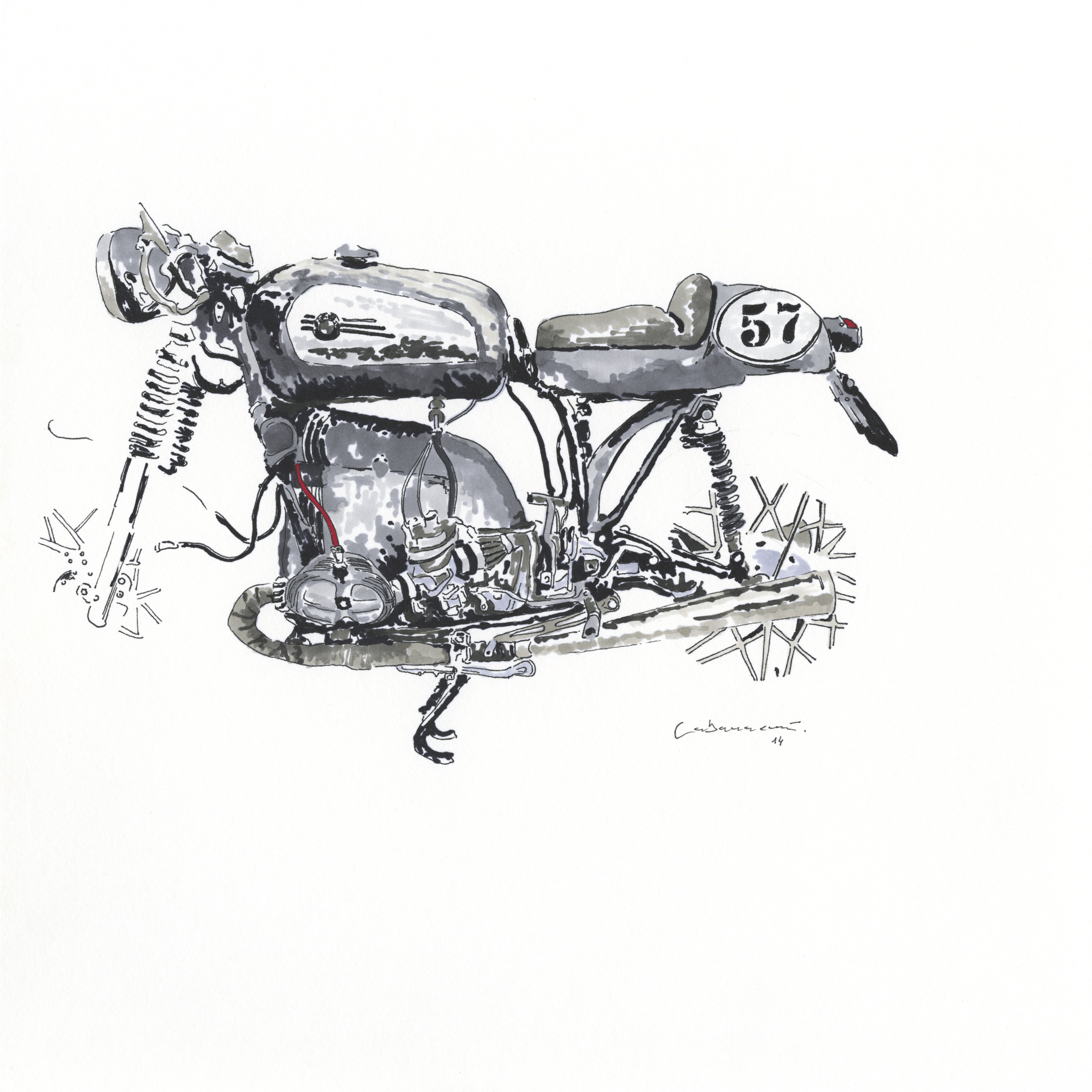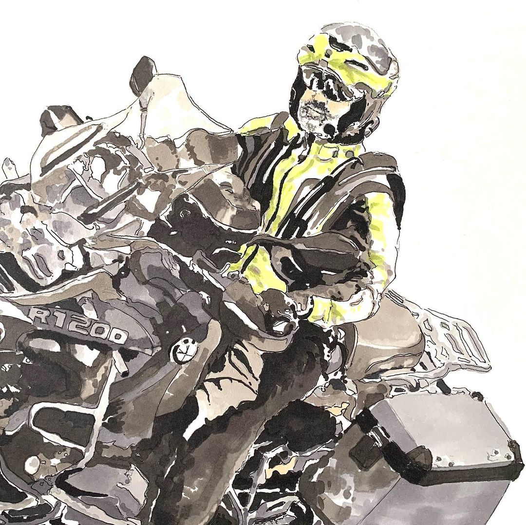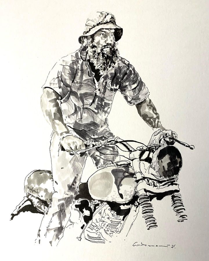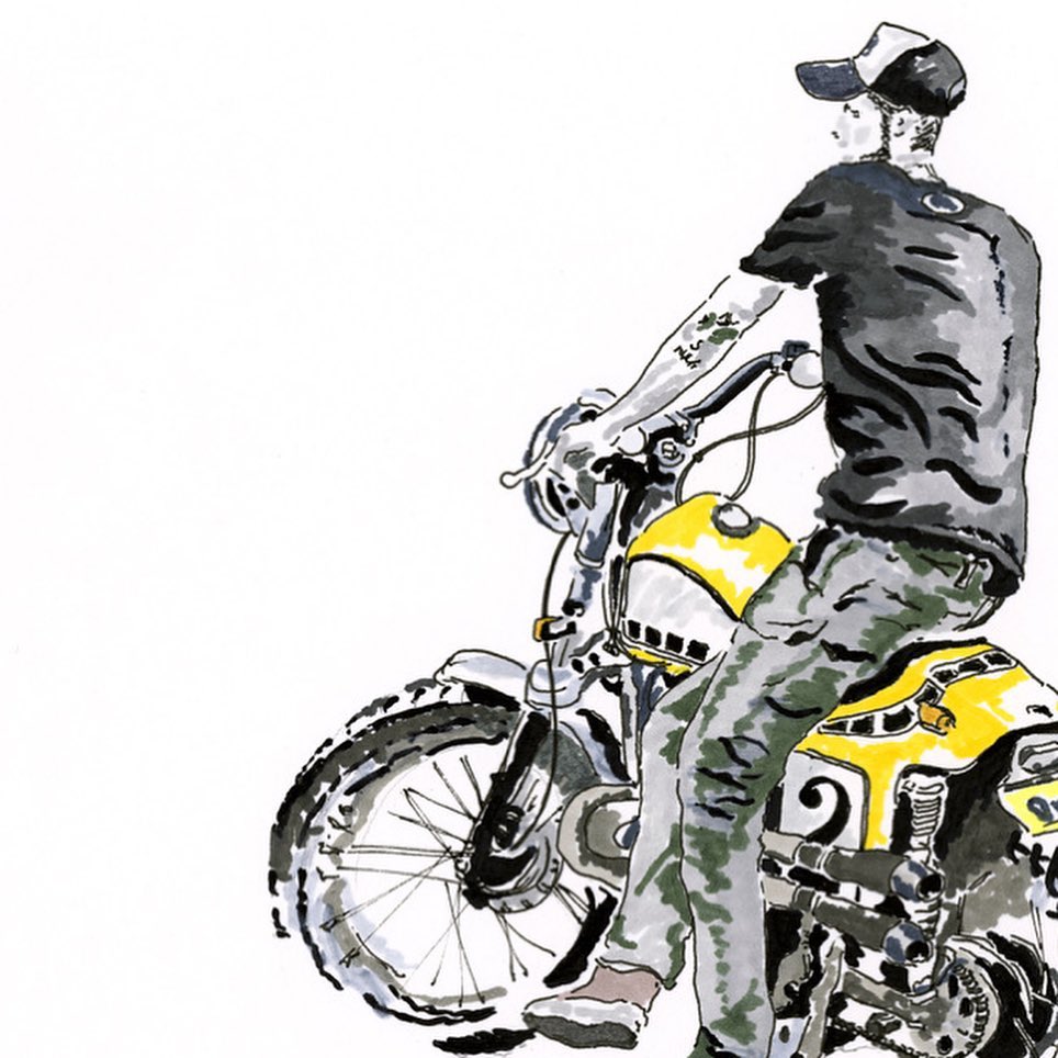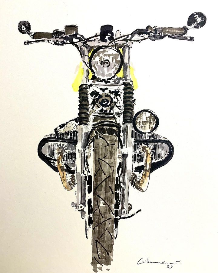 Self-taught ink artist Cabanaem‘s improvised drawings fuse lifelong loves of motorcycles and music. Having been exhibited worldwide and with large acclaim from international musicians and bikers, Cabanaem still chases those quiet late-night drawing sessions, where only pen, paper, and good music are needed.