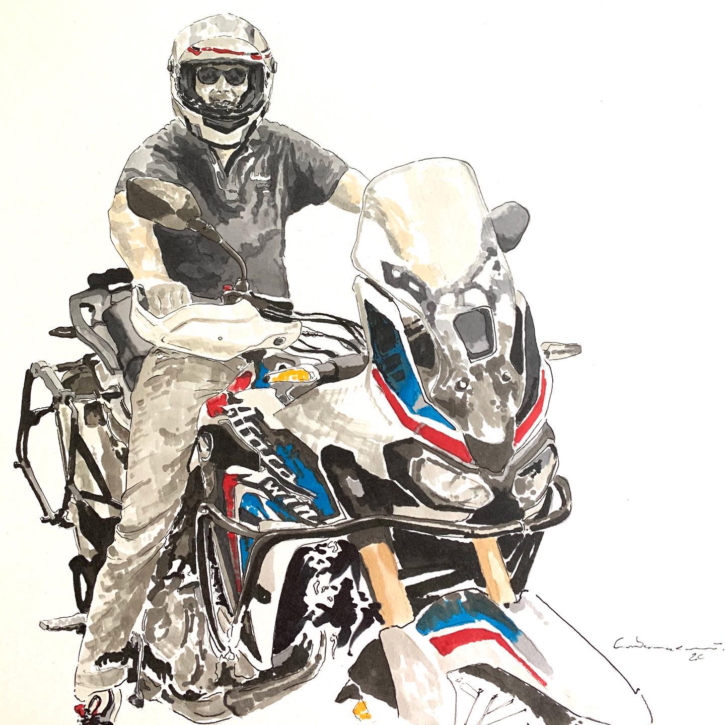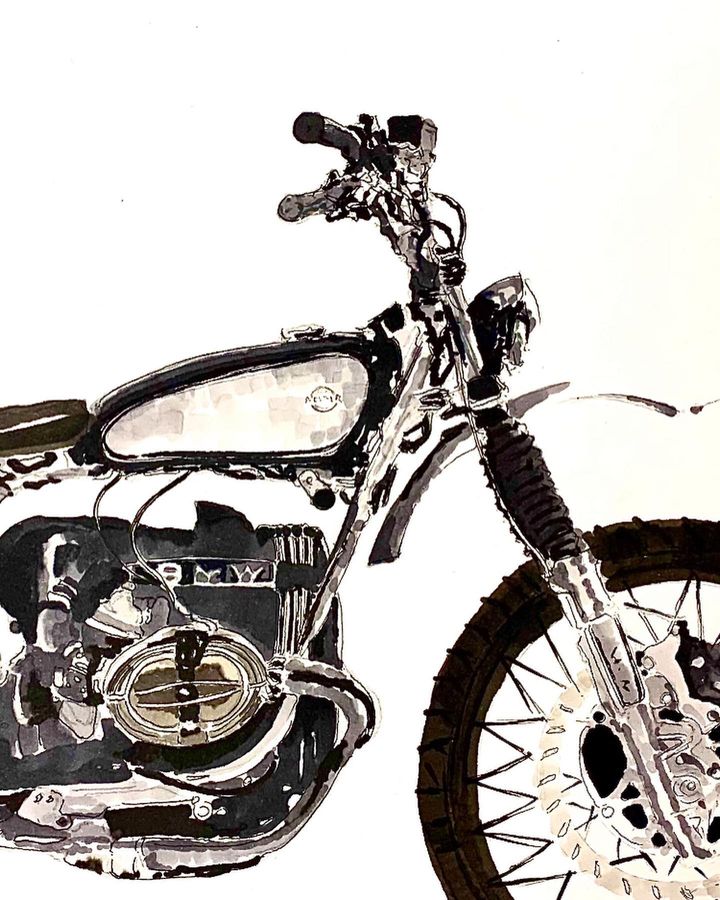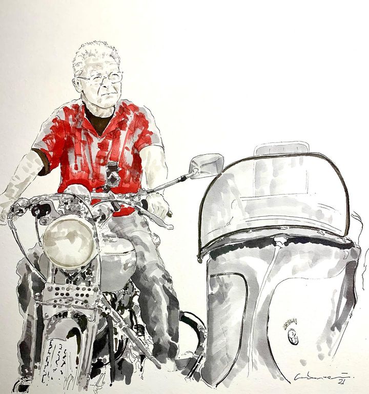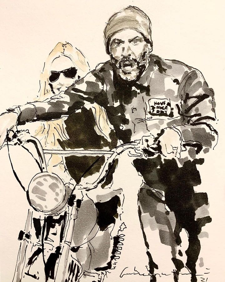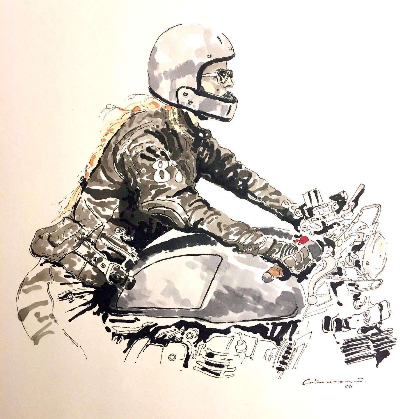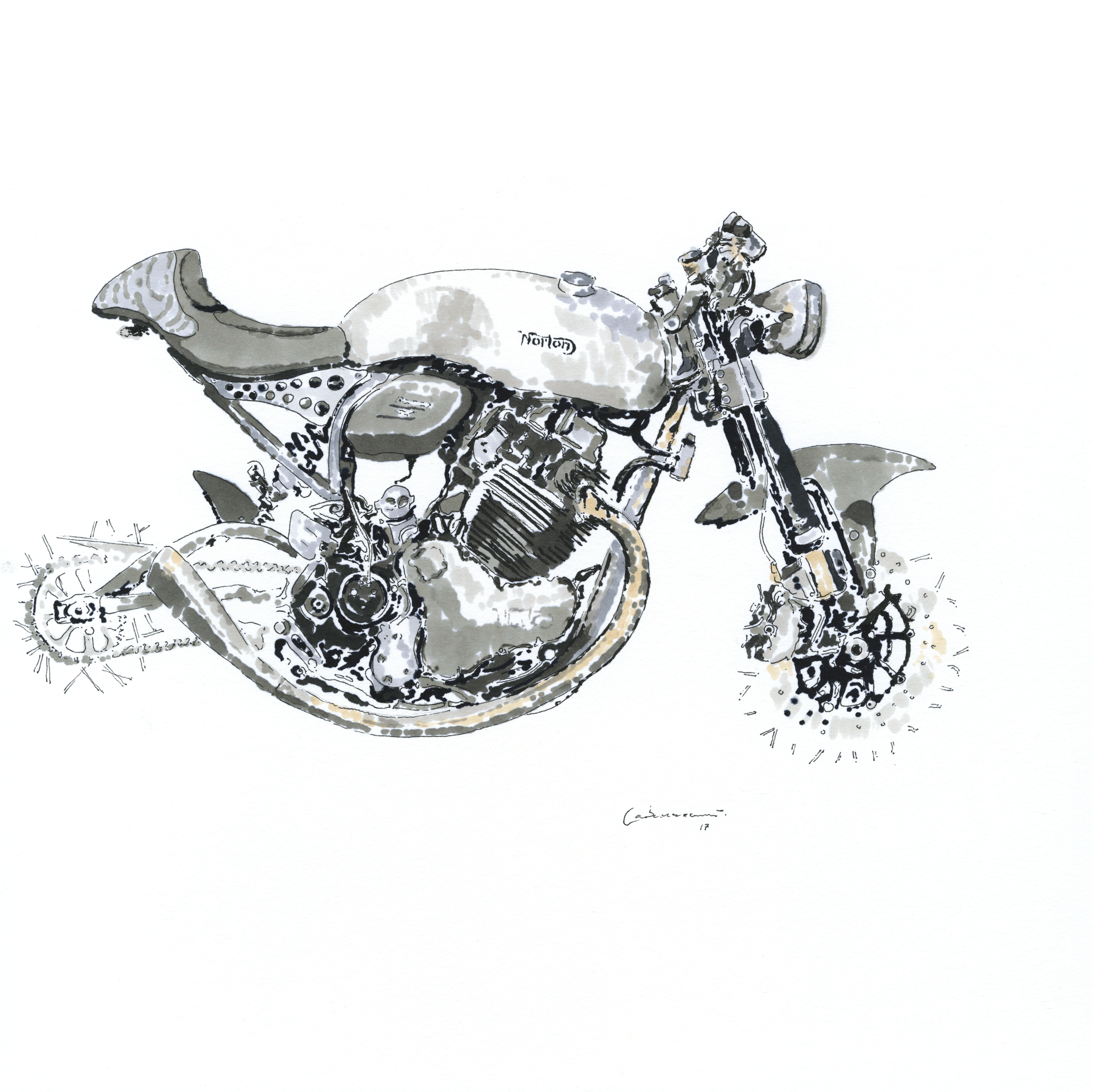 Self-taught ink artist Cabanaem‘s improvised drawings fuse lifelong loves of motorcycles and music. Having been exhibited worldwide and with large acclaim from international musicians and bikers, Cabanaem still chases those quiet late-night drawing sessions, where only pen, paper, and good music are needed.
