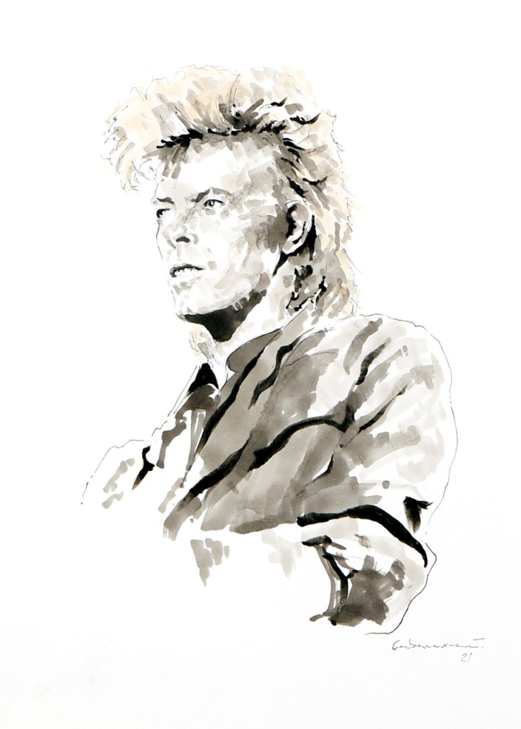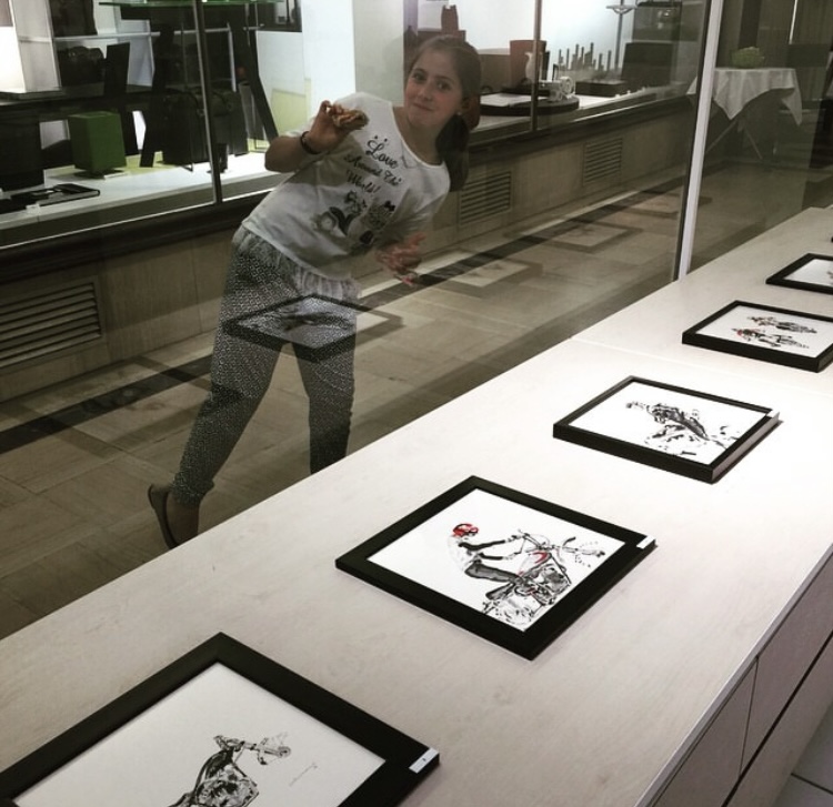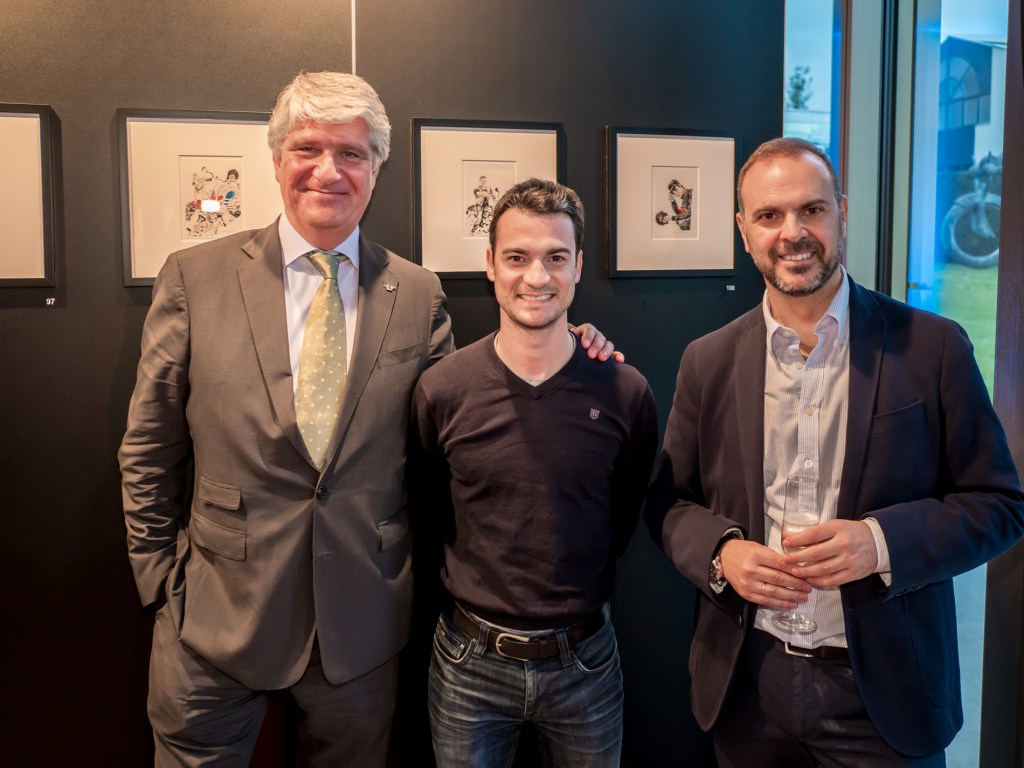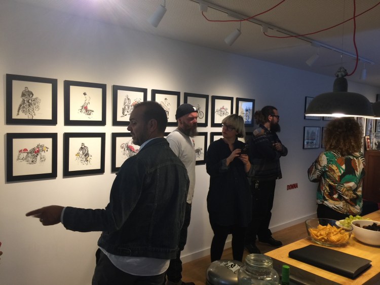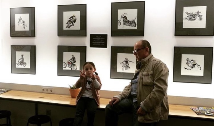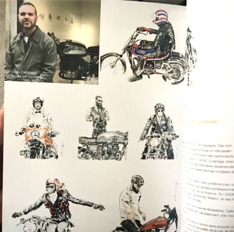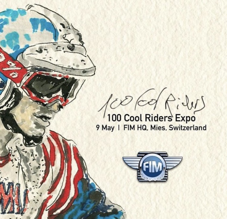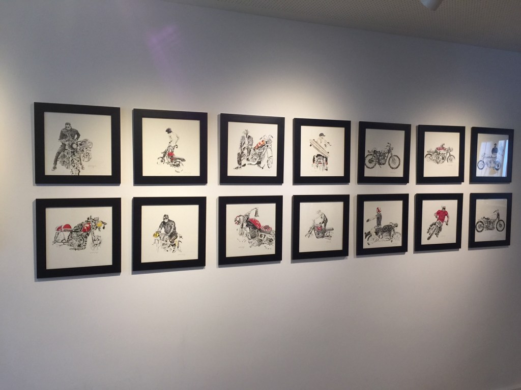 Exhibition at the FIM (Fédération Internationale du Motocyclisme) headquarters, depicting ink illustrations of famous racers, global celebrities, motorcycle icons, and daily riders. Mies, Switzerland.